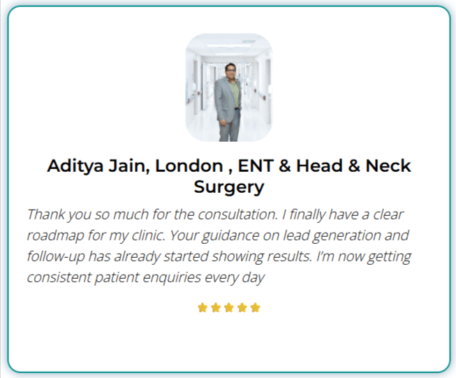 Thank you so much for the consultation. I finally have a clear roadmap for my clinic. Your guidance on lead generation and follow-up has already started showing results. I’m now getting consistent patient enquiries every day